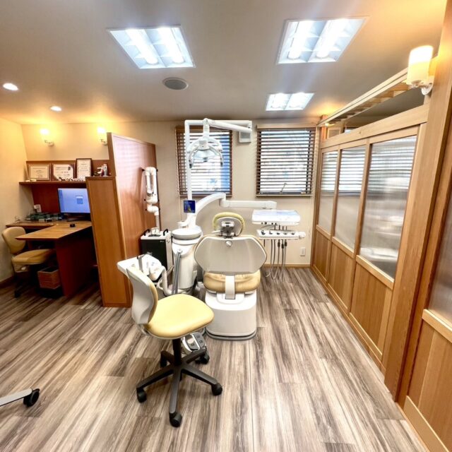 日当りの良い診療スペースは、高い天井で解放感たっぷり。 患者さんが安心して治療に臨むことが出来るよう、隣の診察台とのスペースも広めにとっています。